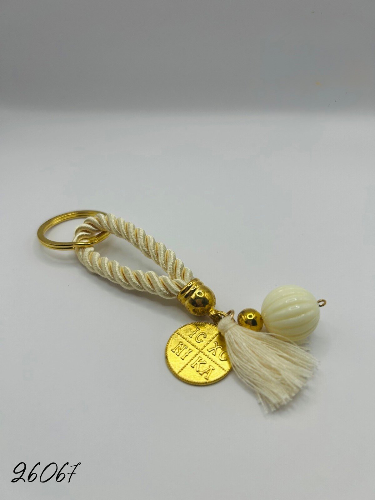 Μαρτυρικό μπρελόκ με κορδόνι στριφτό τρίκλωνο μεταξωτό με χάντρα, φούντα και κωνσταντινάτο.