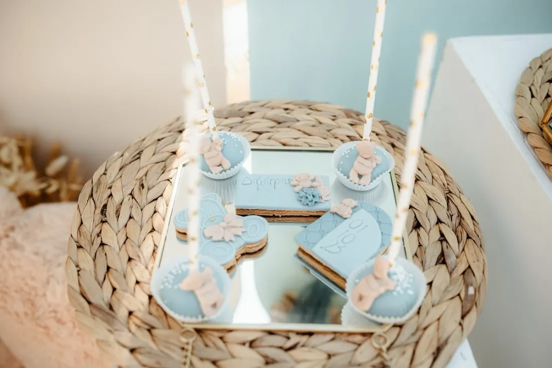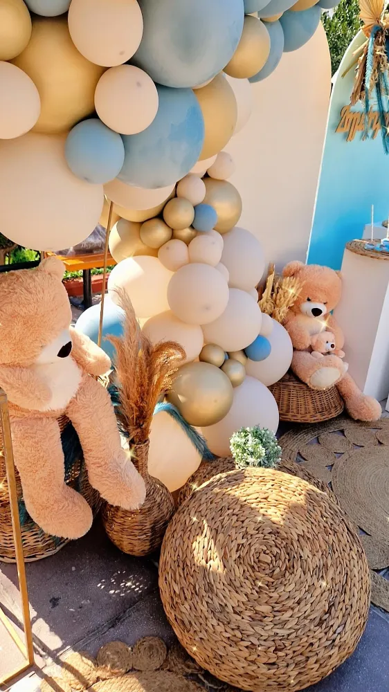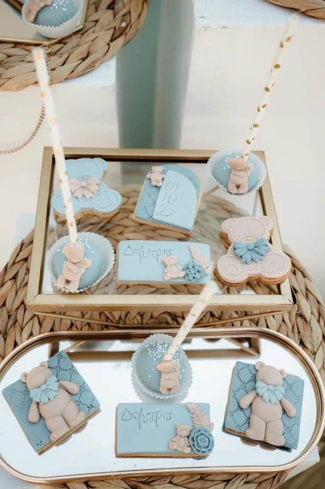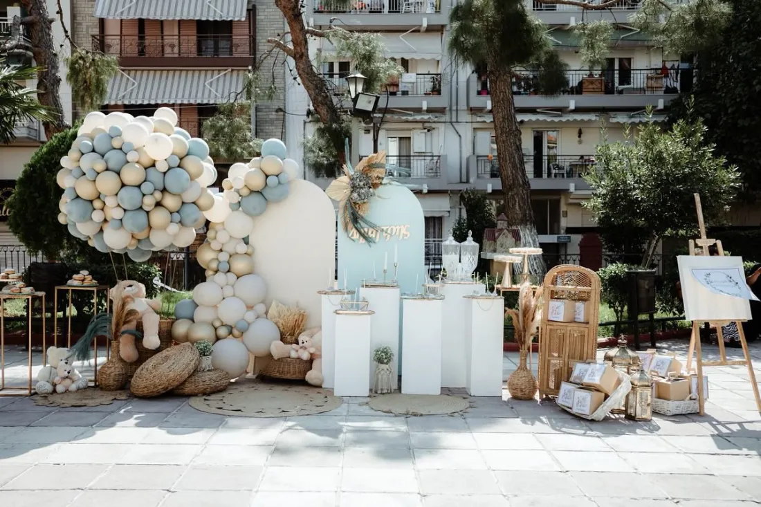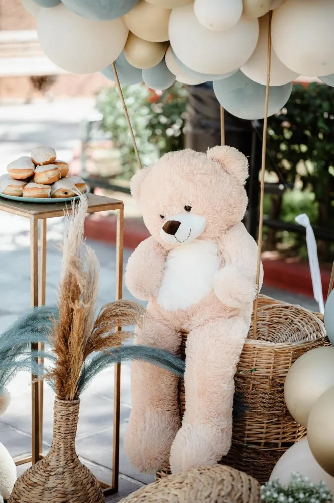 Το χρώμα της μέντας προσφέρει φρεσκάδα, ενώ το αρκουδάκι και το αερόστατο προσθέτουν παιχνιδιάρικη και ρομαντική διάθεση. Υπέροχα γλυκά σε σχήμα αρκουδάκι, boho στοιχεία και μπαλόνια σε γήινες αποχρώσεις συνθέτουν αυτό το μοναδικό αποτέλεσμα!