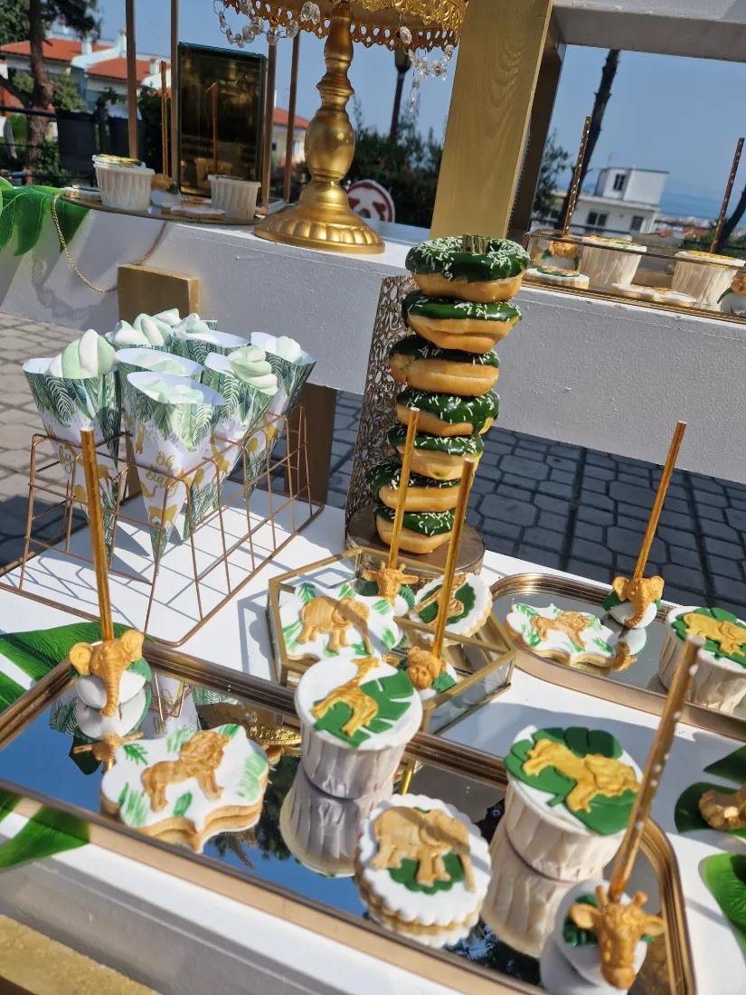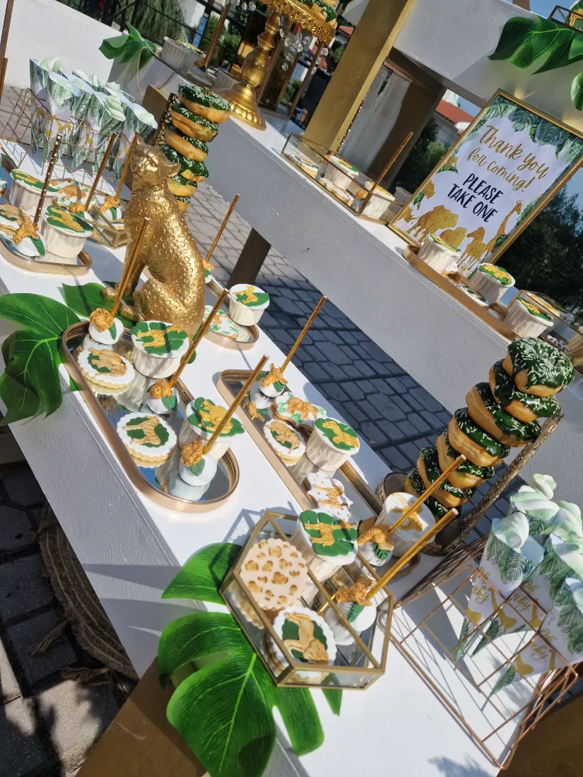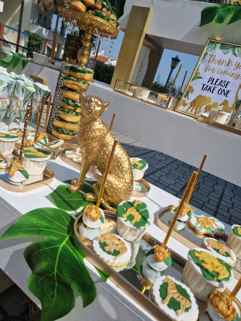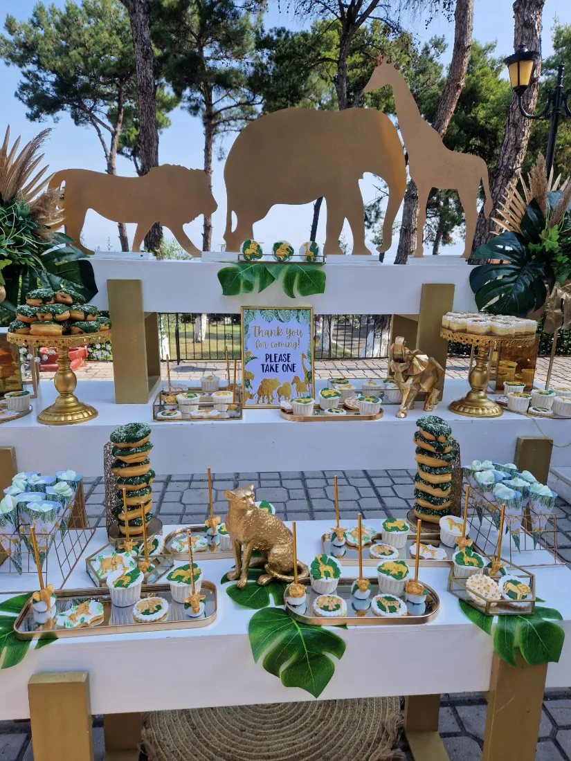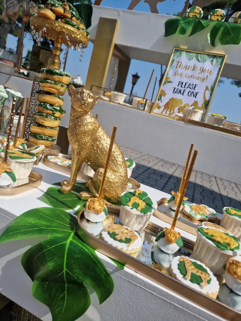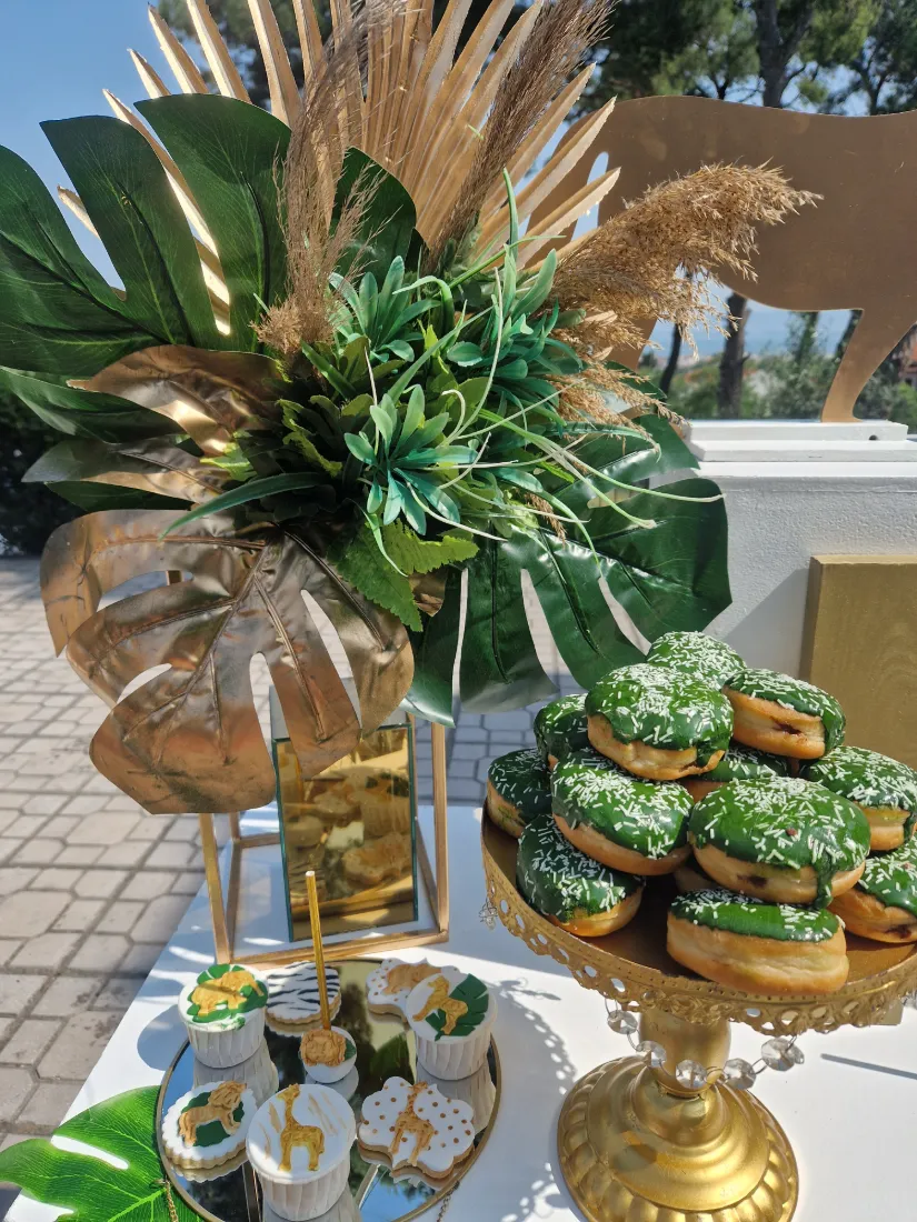 και φέρνει μαζί του την αίσθηση της φύσης, συνδυάζοντας αρμονικά το πράσινο χρώμα με το χρυσό. Διακοσμητικά αντικείμενα όπως πράσινα φύλλα, φιγούρες με μικρά ζωάκια και γλυκά στο θέμα της βάπτισης δημιούργησαν την απόλυτη ατμόσφαιρα για μια υπέροχη βάπτιση.
