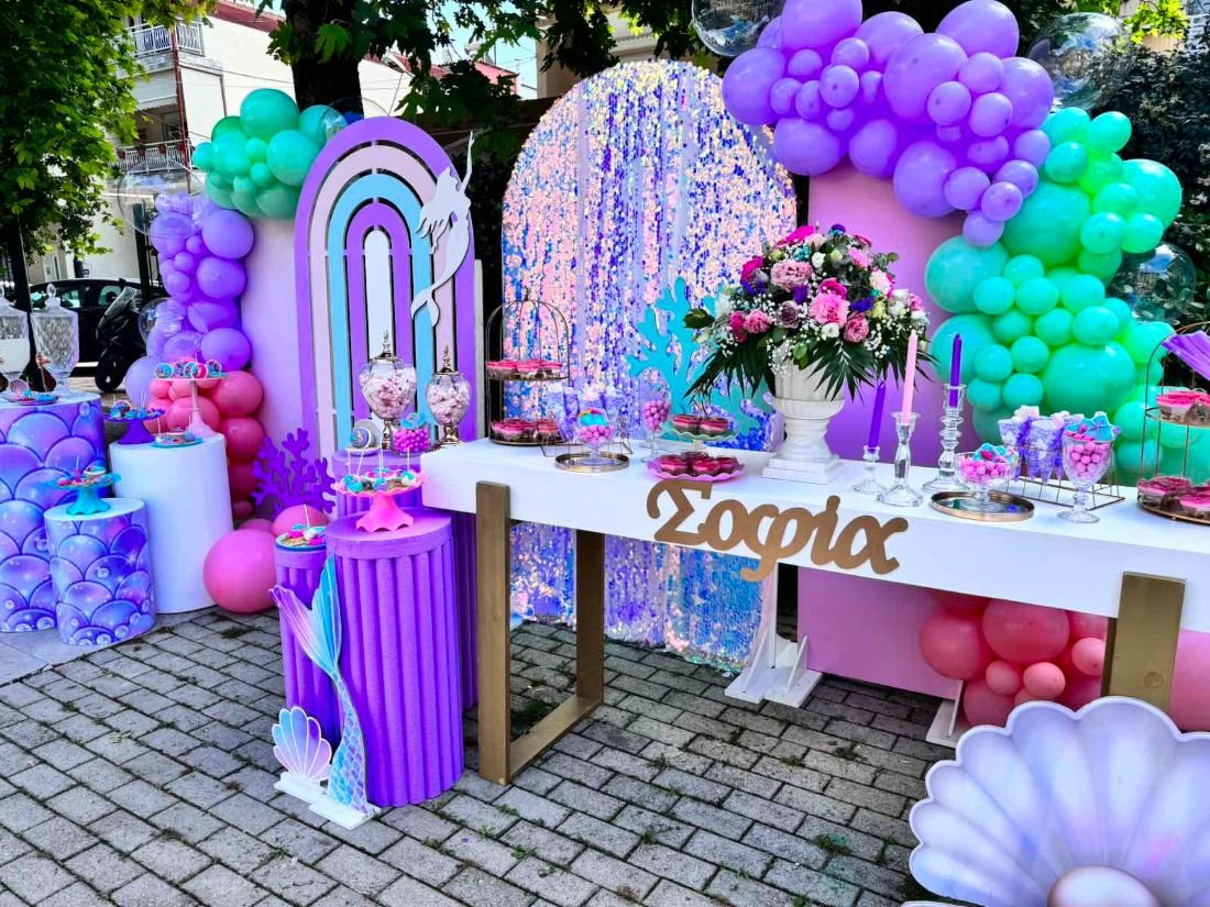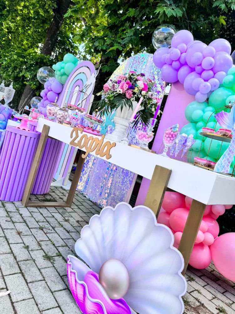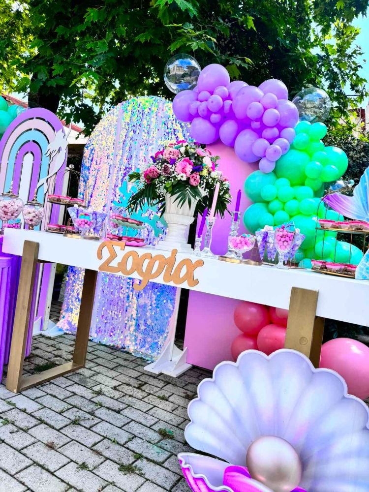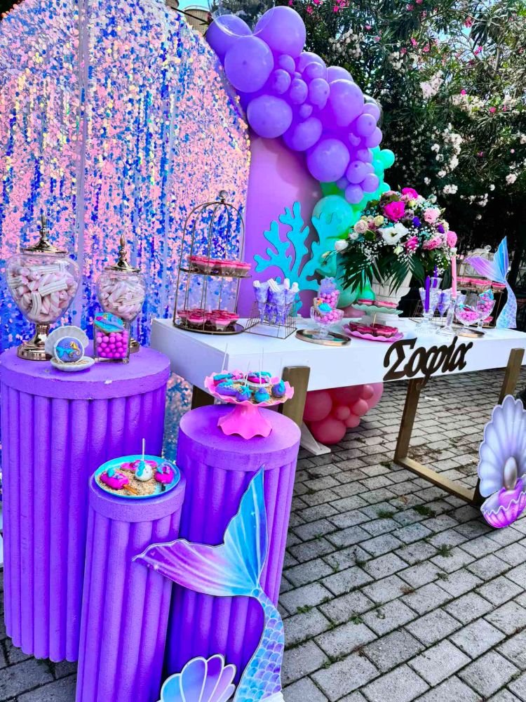 Στολισμός βάπτισης γοργόνα 2. Το θέμα της γοργόνας συνδυάζει την αίσθηση της θάλασσας, της φαντασίας και της ομορφιάς του βυθού, δημιουργώντας μία ατμόσφαιρα γεμάτη χρώματα και λάμψη.