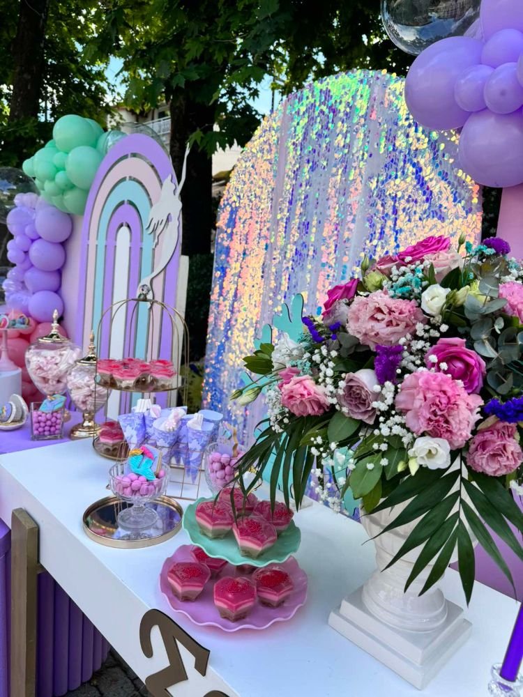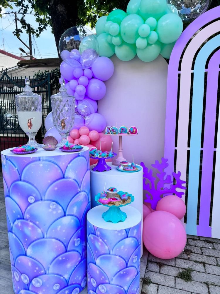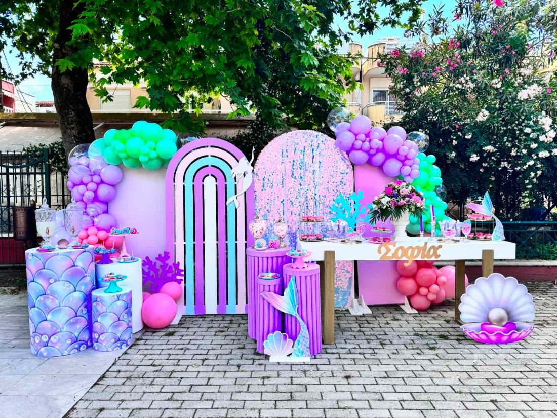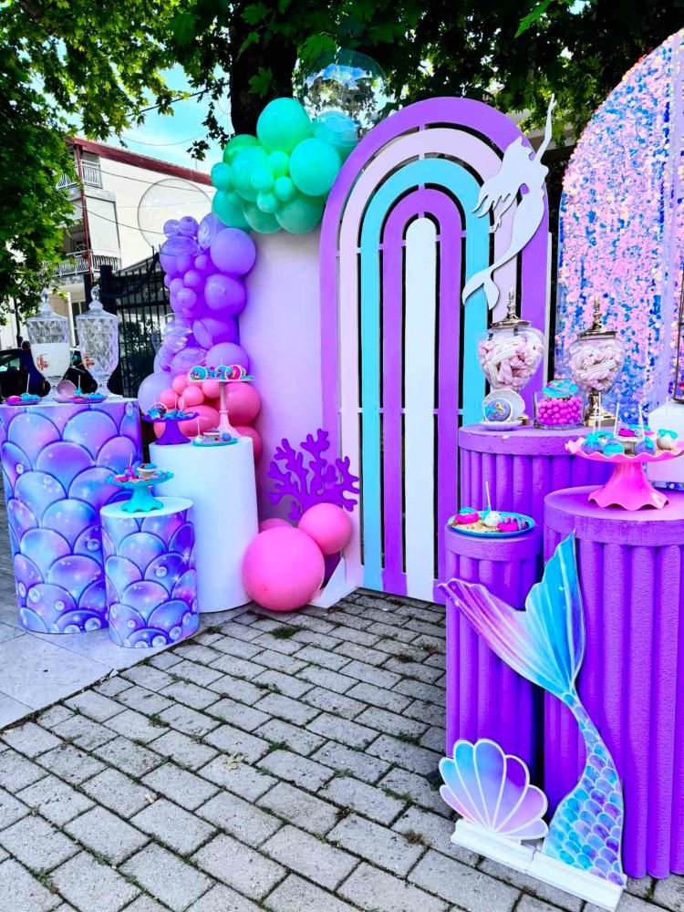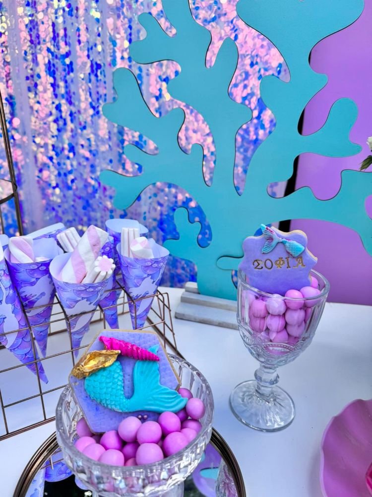 Στολισμός βάπτισης γοργόνα 2. Το θέμα της γοργόνας συνδυάζει την αίσθηση της θάλασσας, της φαντασίας και της ομορφιάς του βυθού, δημιουργώντας μία ατμόσφαιρα γεμάτη χρώματα και λάμψη.